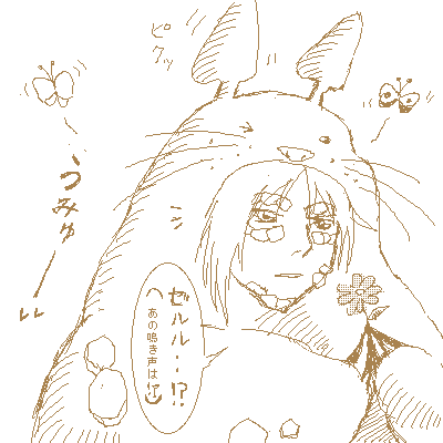 の管理人キャットフードさんことにゃんこめしさまに、我が家の知る人ぞ知るゼゼルという珍獣(ゼルガディス(キメラ)&ト○ロがさらに合成されました)とにゃんこめしさまの姫チューの合作を描かせて下さい。(ピカチューな姫です。めっさ可愛いっす)と言って許可を得たブツです。