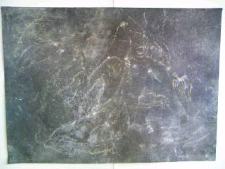 歯ブラシとヘアブラシ(百均)を使って水彩と日本画の顔料(色付の粉と思って下さい)をこすりながら作りました。